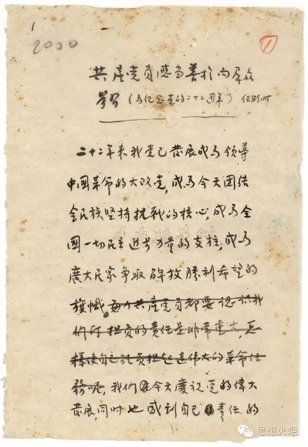 1943年6月,为纪念中国共产党成立22周年,任弼时撰写的《共产党员应当善于向群众学习》(资料照片)。
