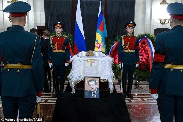 葬礼仪式上,卡尔洛夫大使的画像被放置在他的棺木前。