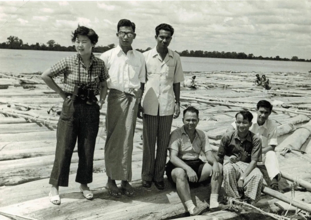 1954年,李桓英(左一)在缅甸伊洛瓦底江畔与缅甸技术人员合影。 北京市委宣传部供图